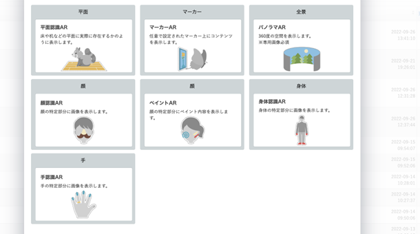 1. コンテンツ表示方法を選択: 『LESSAR』の管理画面にて、新規作成から「手認識」を選択。