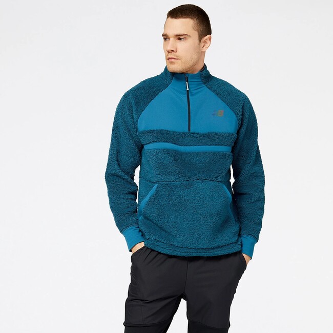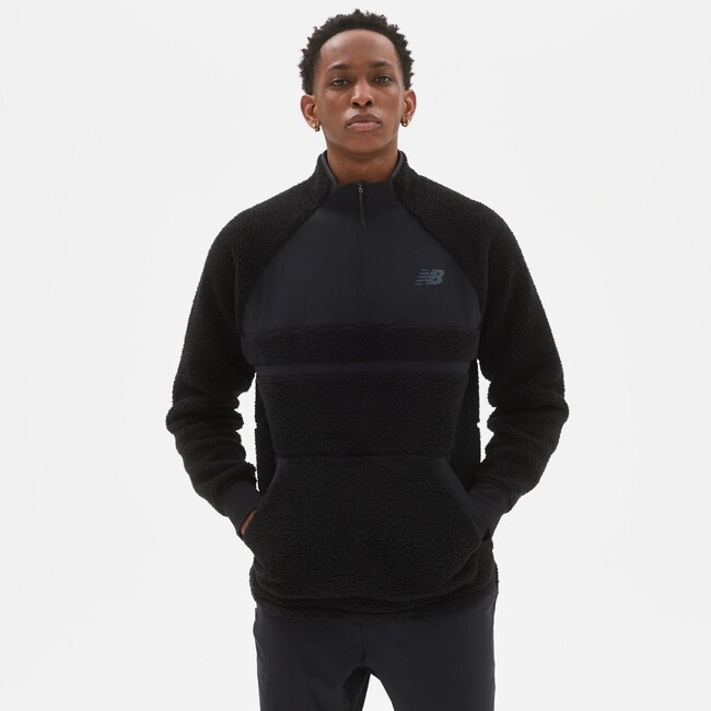 柔らかく暖かい NB HEAT 搭載のシェルパ素材を使用し、脇下を動きやすいニット素材で切替えたアノラック。ランニングを快適にサポートするリフレクト機能やカンガルーポケットの中にあるスマートフォンを収納できるポケットインポケットを備えます。