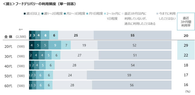直近3か月の利用率は20%、20代の利用率は29%と最も高く、次いで30代の22%。若い年代ほど利用率は高い。<図1>
