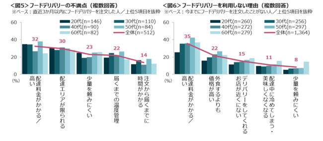 フードデリバリーの不満点は、「配達料金がかかる/高い」「配達エリアが限られる」「少量を頼みにくい」「届くまでの温度管理」など。<図5>また、今までにフードデリバリーを利用したことのない人では、「配達料金がかかる/高い」「外食するよりも価格が高い」「デリバリーをしてくれるお店が近くにない」という点があげられた。<図6>利用者の不満点や未利用の理由は、”価格”や”配達エリア”によるものが多く、特に50代は価格面の不満が高かった。