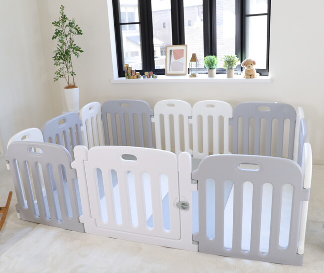 圧迫感のない丸いデザインと優しいカラーがインテリアに馴染みます。また、形や大きさのアレンジが可能。マットとセットで、更に安全・快適なベビースペースになります。