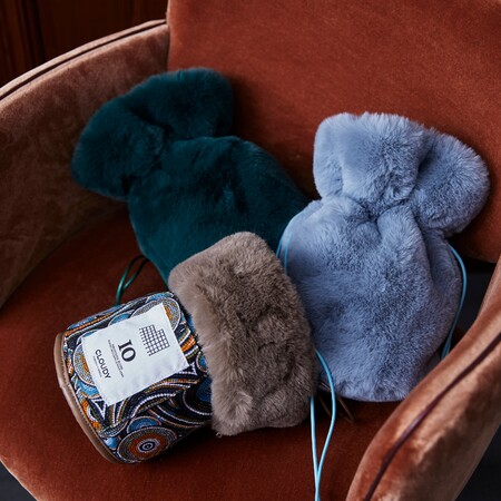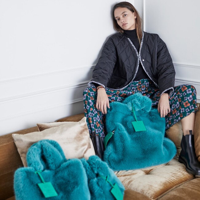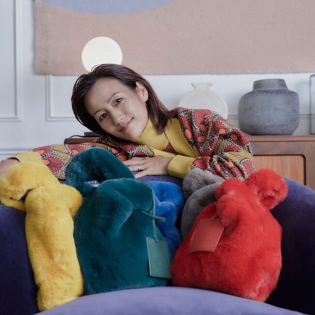 コンビニエンスストアの袋をモチーフにしたファーバッグ。心地良いエコファーの内側には、色鮮やかなアフリカンファブリックが広がります。(税込¥9,900)