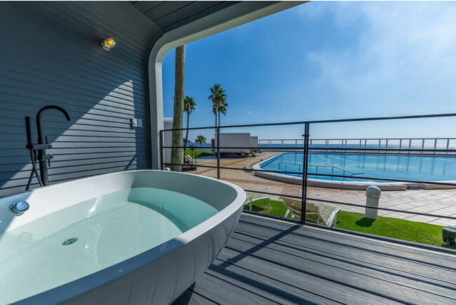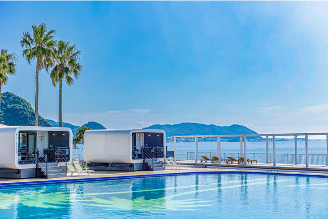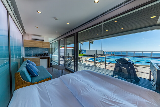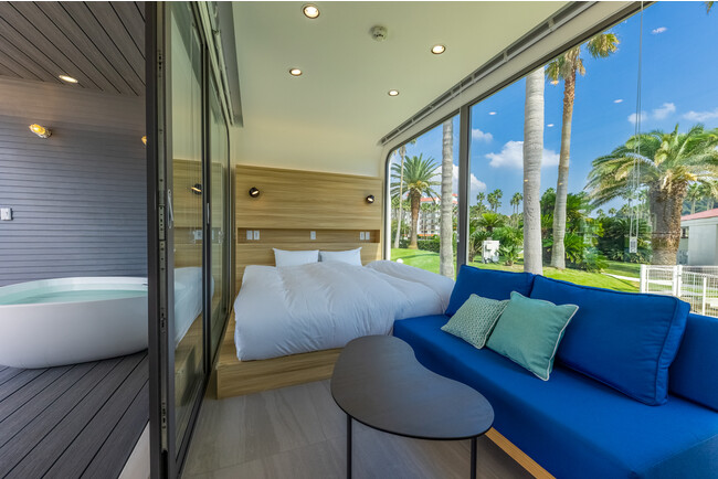 近未来的な丸みを帯びたフォルム。開放感ある一面のガラスに、そよぐ潮風を楽しむ広いテラスを有する客室は、オーシャンビューの好立地を存分に楽しんでいただく為の日本初の新たなデザイン。