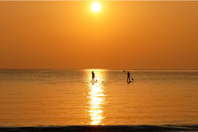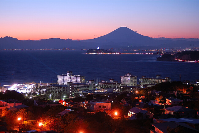一直線に伸びる水平線。湘南の海が目の前に広がる神奈川県東部の海辺の町・逗子(ずし)。隣町の鎌倉と同じ海と山に囲まれた自然豊かな場所で幻想的な夕日の情景、遠くに富士山を望む好立地に位置する海のリゾート「リビエラ逗子マリーナ」。