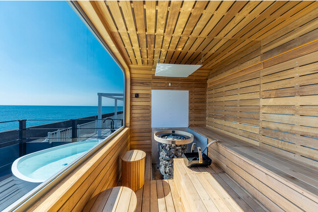 大海原を一望する大きな窓、木のぬくもりに包まれた本格フィンランド式サウナを楽しむプライベートスペース。セルフロウリュでじっくり温まった後は専用テラスの水風呂に。潮風を浴びながら外気浴を行い、贅沢なロケーションならではの極上のととのう体験をお楽しみいただけます。
