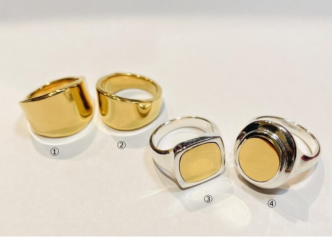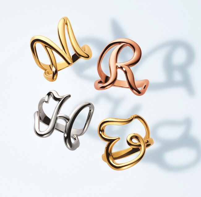 リング イニシャルM 154,000円、イニシャルR 147,400円、イニシャルH 173,800円、イニシャルE 140,800円 ※いずれもリファインメタル ※素材は18金イエローゴールド、ピンクゴールド、ホワイトゴールドからお選びいただけます。※アルファベットは14種類からお選びいただけます。※お渡しは約40日後