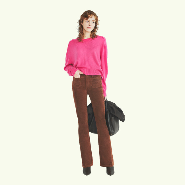 今季注目のピンクの中でも、誰もが憧れる高発色。立体感のあるネックラインのステッチと程よいつまり具合で、首まわりをキレイに見せてくれる。どんなボトムスとも相性の良いクロップト丈。