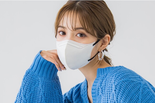 画像からも分かるように、鼻の部分にワイヤーが追加され、より立体感のあるマスクになっています。ワイヤーの他にも特殊加工を施したことによって立体感をキープします。また、マスクの耳紐接着部(上部)の形状にもこだわり抜き、フィット感や小顔効果も追及しました。5Dという名に負けない使用感をお届けいたします。