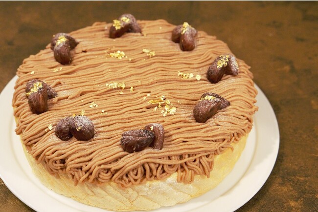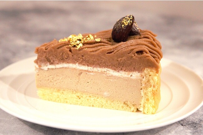 トップには栗の渋皮煮と金沢金箔を華やかに飾り付けて。マロンムースの中にも栗の渋皮煮を忍ばせているので、一口ごとに栗のごろごろとした食感が楽しめるのも魅力です。