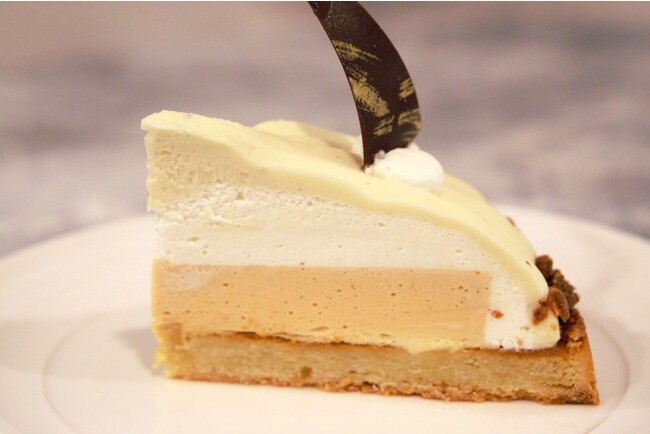 タルト生地に、クレームダマンド(アーモンドクリーム)を流し込み、その上に五郎島金時のクリーム、キャラメルムース、クレームシャンティ、そして最後に再び五郎島金時のクリームを重ねてドーム型に仕上げました。