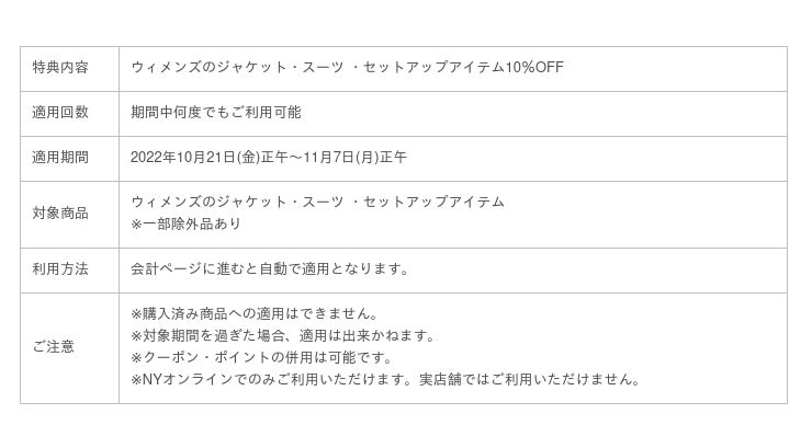 ウィメンズのジャケット・スーツ・セットアップアイテムを期間中にご購入いただくと 10%OFFとさせていただきます! ※一部除外品あり