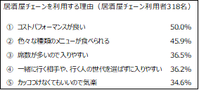 居酒屋チェーンを利用する理由は、「コストパフォーマンスが良い」「色々な種類のメニューが食べられる」「席数が多いので入りやすい」「一緒に行く相手や、行く人の世代を選ばずに入りやすい」という点が上位に挙がりました。