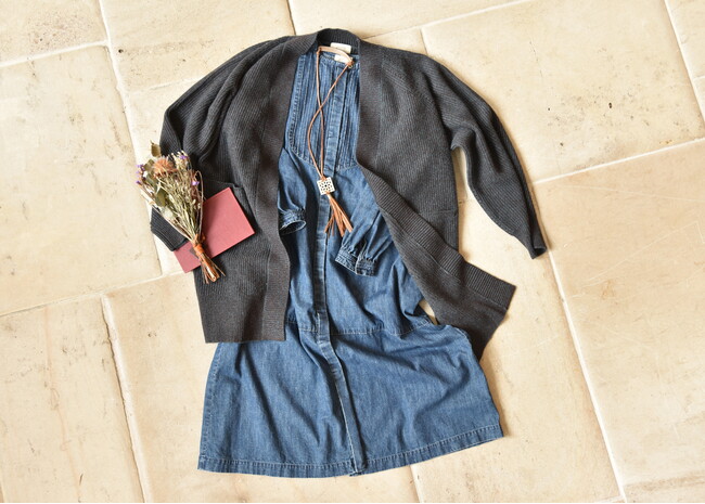 しっかりとした肉感を出しつつ軽やかさを持ち合わせたカシミヤ混の糸の2色を引き揃えて編む事で、深みのある色を表現しています。こげ茶と相性の良いブルーのコーディネートにはウオッシュしたデニムのワンピースで、こなれた印象に。