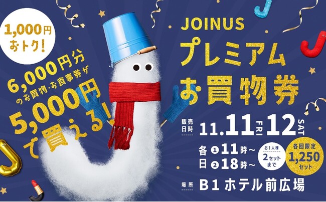 相鉄グループの(株)相鉄ビルマネジメント(本社・横浜市西区、社長・森村幹夫)が運営するジョイナスでは、11月11日(金)・12日(土)に、ジョイナス各店でのお買物・お食事で使えるおトクなプレミアムお買物券を数量限定で販売いたします。