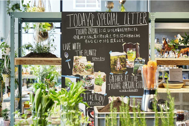 マーケットのような賑やかな店内では、今日使いたくなるものから、明日が楽しみになるもの。ずっと一緒にいたいものまで、うつわや食材、衣料品、本や植物など、さまざまな生活道具を扱います。ちょっとしたDIY 精神を持つことで、自分でできることが少しずつ増え、日常がより軽やかに、そして豊かなものになっていくように。今あるモノやいつものコトを、どうしたらもっとよくできるのか、移り変わる季節をどう楽しむのか。TODAY'S SPECIAL は、食することをテーマに「つくる、食べる、育てる、飾る、装う」など暮らしのアイデアを提案しています。