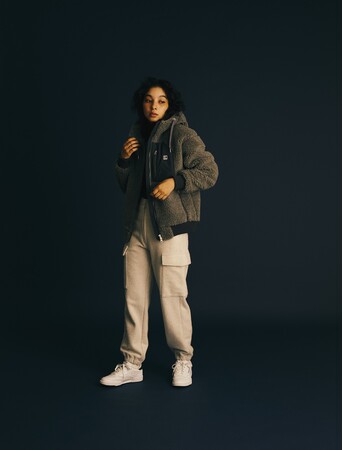 ボア感のあるクラシカルな風合いが特徴のパイルをベースに、さらに厚手で保温力を向上させたファイバーパイルサーモのフーディーです。 防風性のある裏地と組み合わせたフーディーは、寒いシーズンのアウターとして活躍します。フードはドローコードで絞め込みができ、袖口と裾はリブ仕様にして防寒性を高めています。両サイドのポケットは、上部の舟型デザインがさりげないアクセントに。リサイクル糸を使用した環境配慮型素材を使用しています。