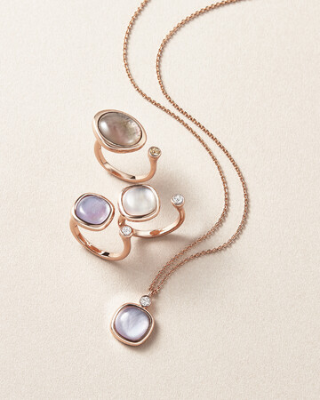 白蝶貝に合成石またはガラスを貼り合わせたオリジナルのダブレットストーンを使用し肌に自然に馴染むニュアンスカラーを表現。奥行きのある艶やかな透け感が魅力です。