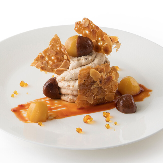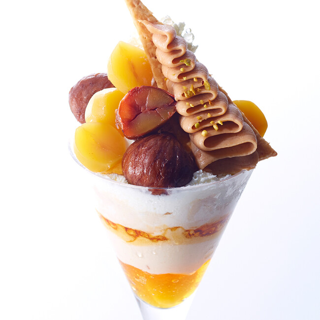 秋の味覚を代表する「栗」は、ほんのり甘くほくほくとした食感をもっています。ホイップクリームとの相性はもちろん、酸味のあるフルーツをアクセントに合わせても栗の甘みが引き立ちます。その他、ほうじ茶や豆乳の食材も使用し、栗のやさしいテイストと重ね合わせています。最後まで飽きずに食べられるよう、すっきりとした甘さの食材も組み合わせて構成されています。