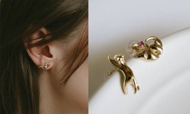 猫モチーフは、両耳でデザインが異なる仕様。他の人と被りにくく、さり気なく個性を出せるユニークなピアスです。
