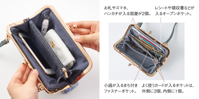 がばっと大きく開くので、スマホやハンカチ、リップなどが入れやすく、取り出しやすさも◎です。コンパクトながら、お札や小銭、カードが入るポケットなど便利な仕切りやポケットもたくさん付いています。