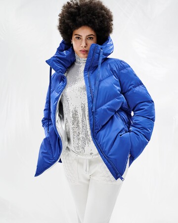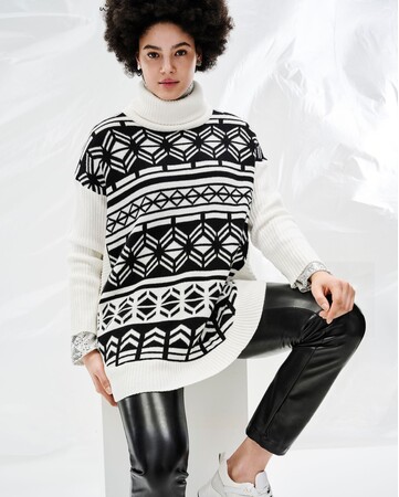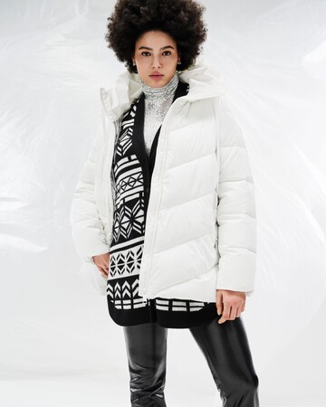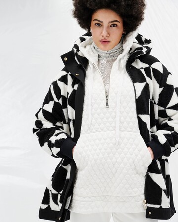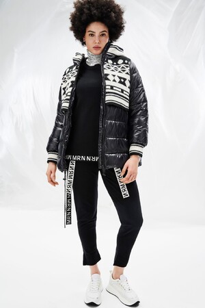白と黒、光沢と不透明、ナイロンとニット。身頃と袖口にノルウェー柄のニットをあしらったシャイニーブラックのダウンジャケット、ベルベット調の素材を使った煌びやかなバージョンなど、本コレクションは正反対の要素を融合させています。