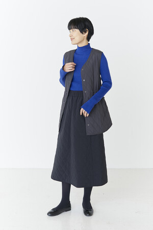 吸湿発熱・はっ水・抗菌防臭機能を持つ、中綿キルティングスカート。ウエストゴム仕様の快適な着心地で、広がりすぎないフレアシルエットは大人のデイリーウエアにぴったりです。自宅で洗えるイージーケアもポイントです。