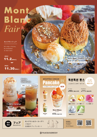 秋に旬を迎える栗をふんだんに使ったメニューを限定販売!なめらかな舌触りの『モンブランパンケーキ』や、キャラメルを使用したコク深い『マロンフラッペ』、見た目にも美しい『抹茶コーヒーラテ』など思わず写真を撮りたくなる、そしてとっても美味しい「モンブランフェア」をお楽しみください。