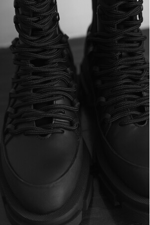 このコラボレーションのために準備された全く新しいデザイン。チェルシーブーツとレースアップブーツが組み合わせられ、興味深く複雑に交差したシューレースのユニークな造形、bothのアイコニックなソールが、Y'sとboth、両者が出会い生まれた限定的なシルエットであることを象徴しています。