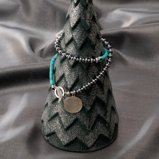 『MIKIA』の定番・ヘマタイト×ターコイズによる2連ブレスレットに、ブランドのエンブレムロゴが入ったトップがアクセント。スペシャルなコラボをお見逃しなく。