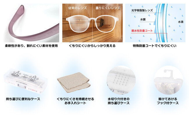 高温サウナでも!軽量・柔軟で、くもりにくい専用メガネでお風呂やサウナを快適に。