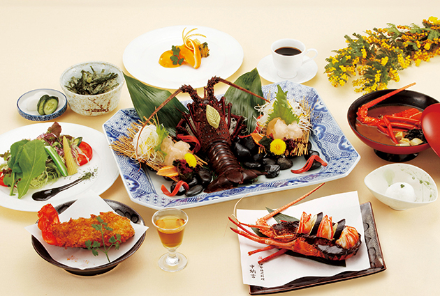 中納言名物「伊勢海老の活造り」「伊勢海老のサラダ、中納言風」「伊勢海老の中納言焼」がそろった伊勢海老堪能コースです。