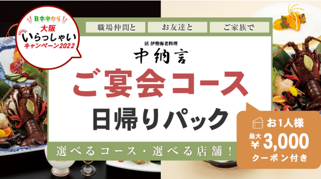 株式会社フォーティーズ(本社:大阪市鶴見区、代表取締役 岡武史)は全国旅行支援割「日本中から大阪いらっしゃいキャンペーン2022」の対象商品として大阪府内の中納言から選べる宴会コースとお車がセットになったパックツアーのオンライン販売を開始しました。