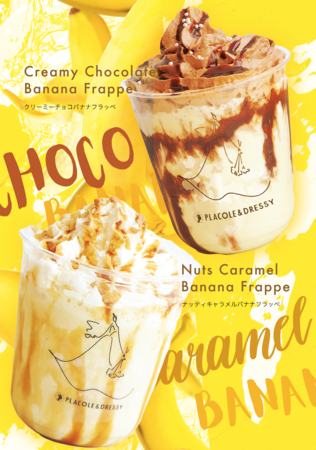 バナナをふんだんにつかったフラッペ。チョコレートとキャラメルの2種をご用意。クリームまでチョコレート、トッピングで食感も楽しめるチョコとバナナの王道の組み合わせと、たっぷりキャラメルソースで甘めのナッツがアクセントになりクリーミーでミルク感もある2種のフラッペとなっております。