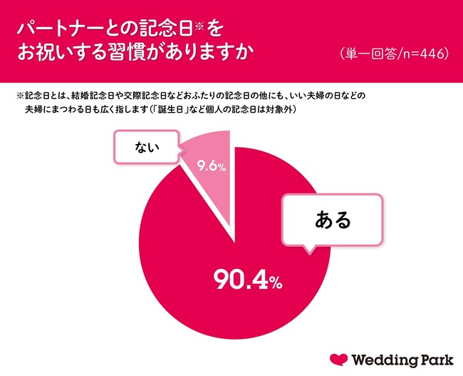 20代~30代のウエディングパーク会員のうち、既婚女性に「パートナーとの記念日※をお祝いする習慣がありますか(単一回答)」という質問をしたところ、「ある(90.4%)」「ない(9.6%)」という結果になり、カップルの90.4%がパートナーとの記念日をお祝いする習慣があることがわかりました。