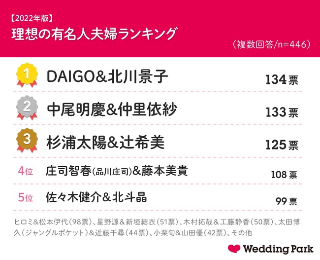 「あなたが理想の夫婦だと思う有名人カップルを教えてください(複数回答)」という質問をしたところ、1位「DAIGO&北川景子(134票)」、2位「中尾明慶&仲里依紗(133票)」、3位「杉浦太陽&辻希美(125票)」という結果になりました。