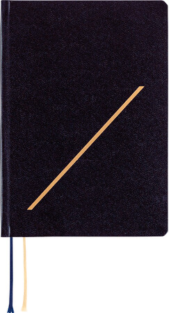 「HON」のベーシックデザイン。限りなく黒に近いダークネイビーに、ゴールドの箔が斜めにスッと入っています。日付を書き表すときに使う記号、スラッシュ(/)がモチーフ。発売記念として3色から選べるスリーブケースに入れて販売します。