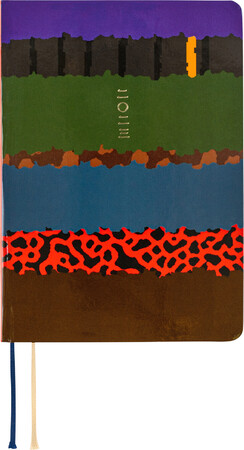 水戸岡鋭治さんのコレクションから「HON」のために選んだイラストです。「夜道」は列車のシートに使われているテキスタイルの一部を抜き出しました。暖かみのある色彩からなるボーダーラインは夜景のようであり、地層のようにも見えます。「水戸岡デザイン」の大胆な配色によって、文庫本の装丁らしい雰囲気をまとっています。西暦の数字は「二〇二三」と縦書きで表記。