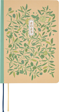 JR九州「ななつ星in九州」など鉄道車両や駅舎などのデザインを手掛ける水戸岡鋭治さんとのコラボレーション。これまでに描いた膨大なコレクションから、「HON」に合うイラストを選びました。オリーブの葉や実が描かれたデザインは、文庫本らしい佇まいの優雅な雰囲気。エメラルドグリーンの背表紙や縦書きの「2023」の箔は、「HON」ならでは。
