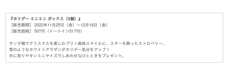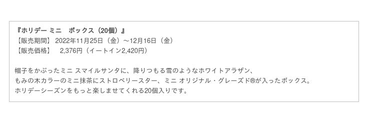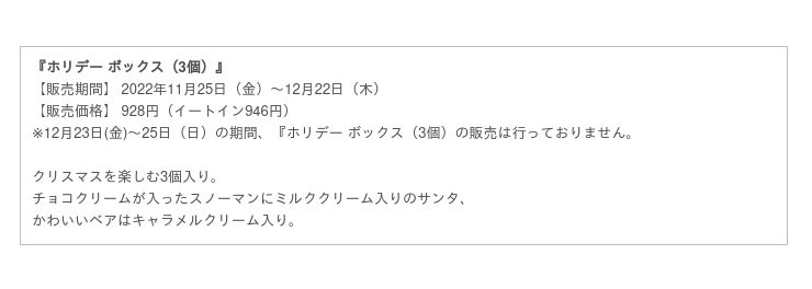 ※2022年12月23日(金)~25日(日)の期間、『ミルククリーム サンタ』『キャラメル クリスマス ベア』『チョコレート スノーマン』『ピスタチオ リース』4種の単品販売及び、『ホリデー ボックス(3個)』の販売を中止します。ホリデードーナツをより多くのお客様に楽しんでいただく為、該当商品の販売を指定のボックス販売に限定させていただきます。