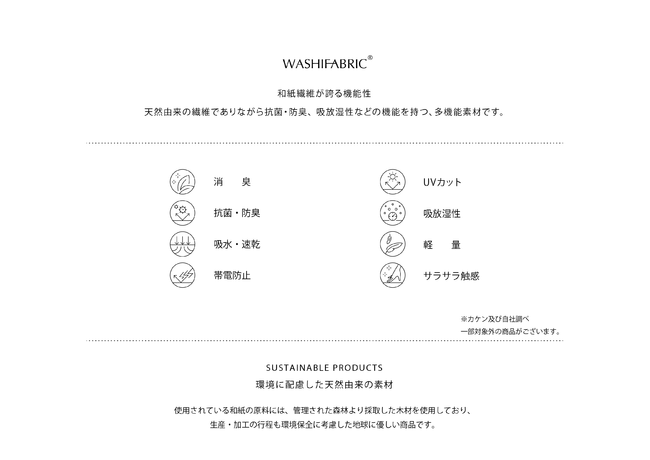 和紙が持つ自動吸放湿性、抗菌・防臭、吸水速乾なの機能性と、さらりとした肌触りを感じられるアイテムです。