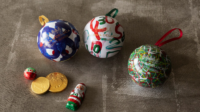 オーナメント缶はに描かれているのは『しょうぶ学園』の利用者の作品です。クリスマスのモチーフ、地球や子どもたちの明るい未来を感じさせるものといったテーマが表現された3名の作品をベースに、書き下ろしの文字をあしらいました。中には、サンタクロースやコインなど、ホリデーモチーフのチョコレートが入っています。