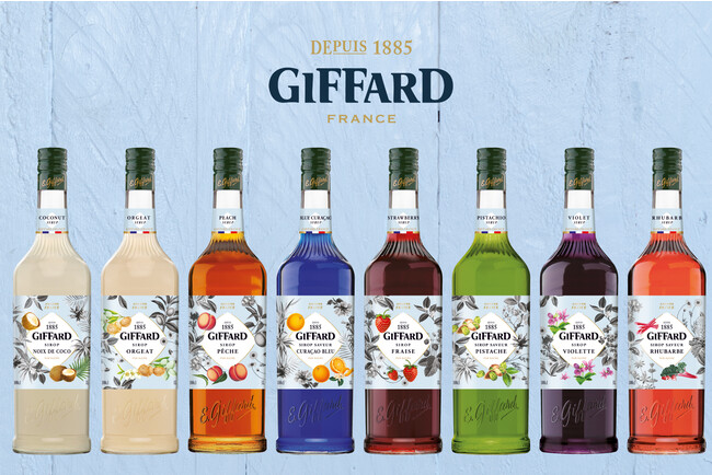創業137年を誇るジファールは、「味こそが最高の素材」という哲学に基づいた、高品質なリキュール&シロップで知られ、世界85か国のバーテンダーやバリスタから信頼のブランドとして支持されてきました。日本でもこの春からシロップのシリーズの展開をスタート。第2弾となる今回は、「ココナッツ」「オルジェ」「ピーチ」「ブルーキュラソー」「バイオレット」「ピスタチオ」「ストロベリー」「ルバーブ」がラインナップに加わります。