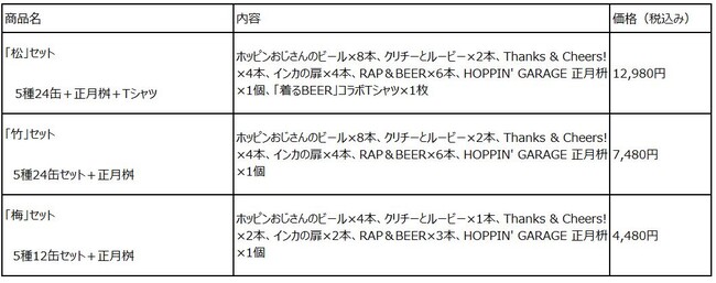 本商品は、「松」「竹」「梅」の3アイテムで、それぞれ「HOPPIN' GARAGE」の今までに発売した人気商品5種詰め合わせと限定グッズをお楽しみいただけるお得な福袋です。商品には、本ブランドのフラッグシップビールの「ホッピンおじさんのビール」のほかに、今までに発売した「HOPPIN' GARAGE クリチーとルービー」、「HOPPIN' GARAGE インカの扉」や、数量限定新発売の「HOPPIN' GARAGE RAP & BEER」をラインナップしています。限定グッズには、「HOPPIN' GARAGE」の焼印が入った正月枡をご用意。「松」セットでは「HOPPIN' GARAGE RAP & BEER」の企画者であるラップグループP.O.P(ピーオーピー)の上鈴木兄弟が手掛けるアパレルブランド「着るBEER」(注2)とコラボレーションしたTシャツも取り揃えています。クリスマスや年末年始を華やかに彩るお得なセットです。当社は「HOPPIN' GARAGE」を通して多様性あふれるビールを生み出し、そのストーリーを味わいながら飲むという、新たなビールの楽しみ方を提供することで「新しいお酒のある豊かな社会と生活」に貢献していきます。