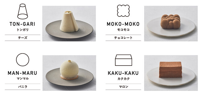 なじみのあるスイーツたちを、一見ケーキに見えない不思議な形で再現しました。想像力がかきたつように、装飾も色もシンプルな形にしています。親しみやすいよう、形から連想される名前をつけました。