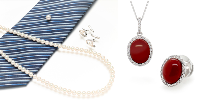 【30周年】真珠 左:アコヤパールロングネックレス 330,000円 中:アコヤパールタイタック 77,000円 右:アコヤパールカフス 49,500円【35周年】珊瑚 左:赤珊瑚「サンライズ」ペンダント 319,000円 右:赤珊瑚「サンライズ」タイタック 308,000円