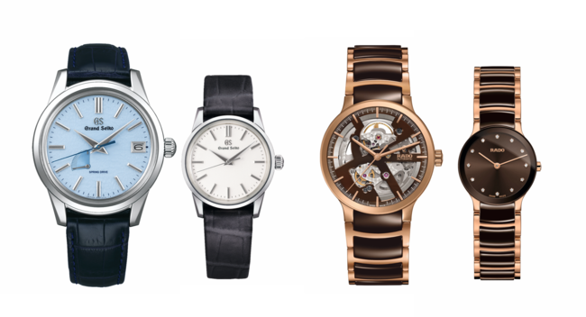 【ペアウォッチ】<グランドセイコー>左:エレガンスコレクション SBGA407 682,000円 右:エレガンスコレクション SBGX347 385,000円 <ラドー>左:セントリックス オートマティック オープンハート R30181312 279,400円 右:セントリックス ダイヤモンズ R30190702 236,500円