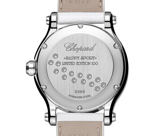 そのアイコンウォッチから、日本限定のエクスクルーシブなモデルが登場します。手首にぴったりとフィットする30mm径のステンレススティール製ケースの文字盤上では、マジカルなウィンターシーズンをプレイフルに彩るショパールのオリジナルキャラクター、クマの“アーティー”を模った世界初のムービングモチーフがくるくるとダンス。雪玉を思わせる3石のムービングダイヤモンドと戯れるアーティーの愛くるしい姿に、思わず笑みがこぼれます。そして、ケースバックには、降り積もった真っ白な雪原に残る、何とも愛らしいアーティーの足あとがエングレービングされています。ウォッチの着用者だけが楽しめる特別なディテールを完成させています。
