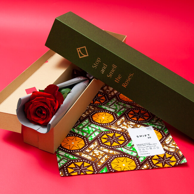 赤いバラをエレガントなシルバーのラッピングでお包みして、ケニア・ナイロビの巨大スラム街キベラにある工房で、職人さん・職人の見習いさんたちがひとつずつ心を込めて足踏みミシンで製作した「SHIFT 80」のトートバッグを入れてお届けします。