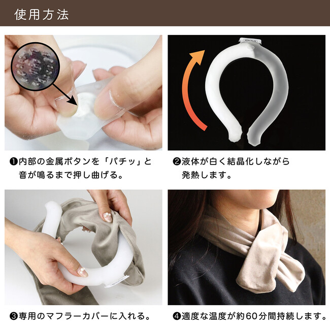 内蔵されている金属ボタンをパチッと押し曲げると、中の液体が白く結晶化(固体化)しながら発熱します。専用のマフラーカバーに入れて使用してください。