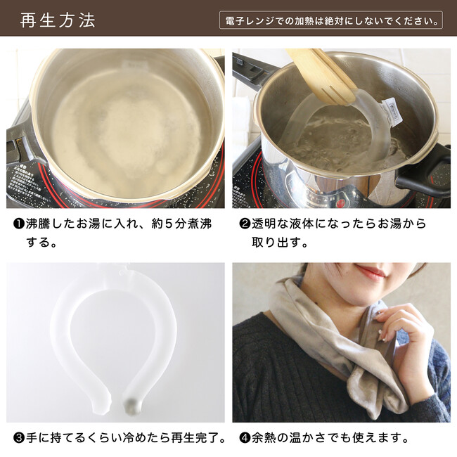 沸騰したお湯に入れ約5分煮沸します。取り出して手に持てるくらいに冷めたら再生完了です。その後、好きなタイミングで金属ボタンをパチッと押し曲げると再び使用可能。また、煮沸した際の余熱も利用して温まることもできます。